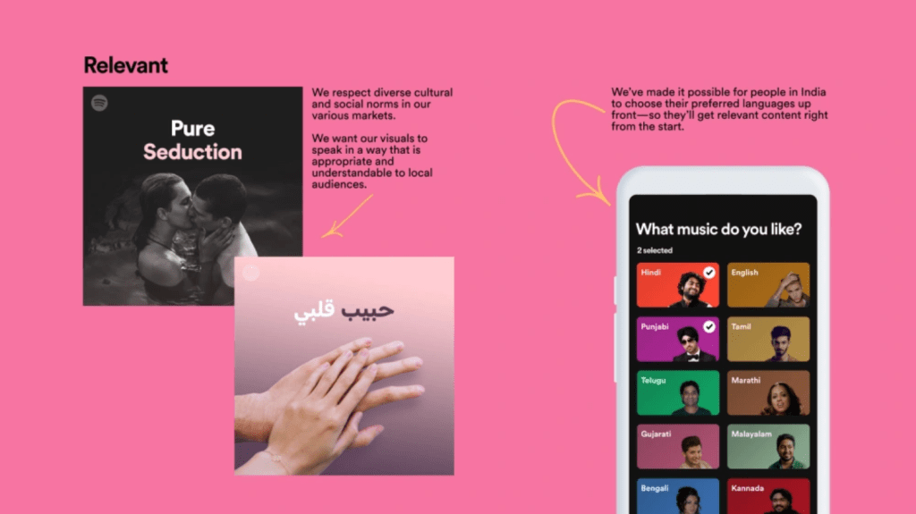 Spotify is made for you—we want it to feel personalized. To be relevant, we need to be thoughtful about what we present, to whom, and in what context. In simpler terms, it’s relevant when we present the right info at the right time. The opposite value is that we don’t want “one-size-fits-all” experiences.