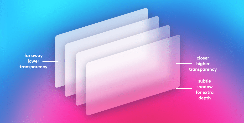 Glassmorphism is just what you might think: Design elements that have a look that’s reminiscent of glass. There may be elements of transparency, frostiness, or glossiness.