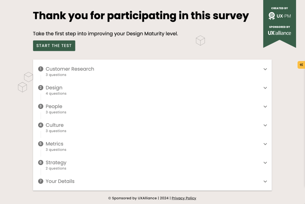 - Utilize a Design Maturity assessment tool – You can utilize a free Design Maturity assessment tool. I recommend the assessment survey from UX-PM, where you can send the link out to everyone in your organization and they can send you their final score along with a screenshot of the final analysis.