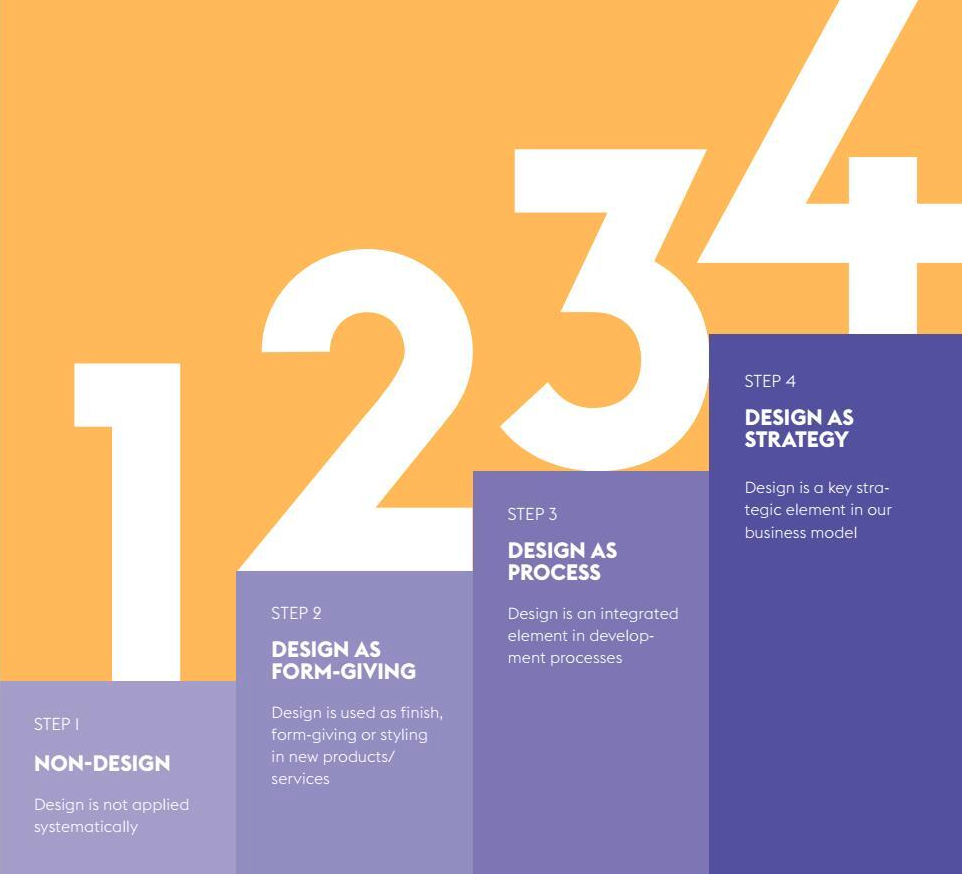 - Rung 4: Design as Strategy – Design at this level is embedded in the leadership team. Design is embraced and allowed to play a part in shaping the overall business concept. It is employed to create a vision of the company for the future and then to forge the ways the company is going to get there.