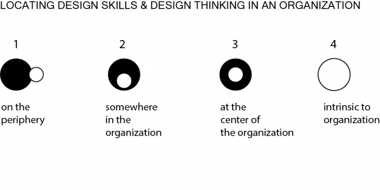 - Design on the Periphery – The most common location for design in organizations is on the periphery. Design thinking and design methods have no continuous presence in the organization. Design is considered an add-on, limited to traditional design problems such as form, function and communication.